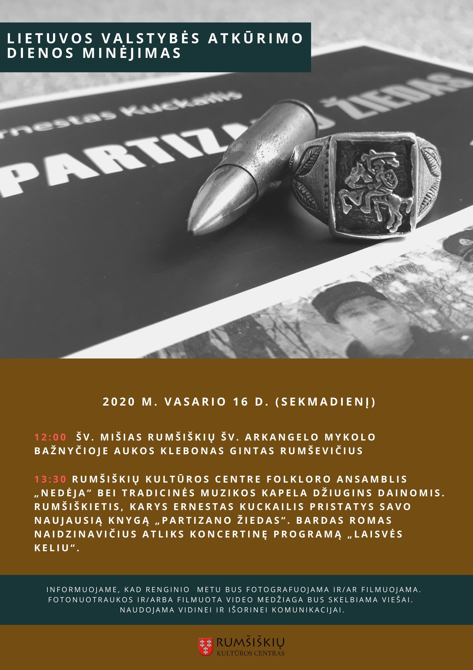 13:30 Rumšiškių kultūros centre Folkloro ansamblis „Nedėja“ bei Tradicinės muzikos kapela džiugins dainomis. Rumšiškietis, karys Ernestas Kuckailis pristatys savo naujausią knygą „Partizano žiedas“. bardas Romas Naidzinavičius atliks koncertinę programą „Laisvės keliu“.